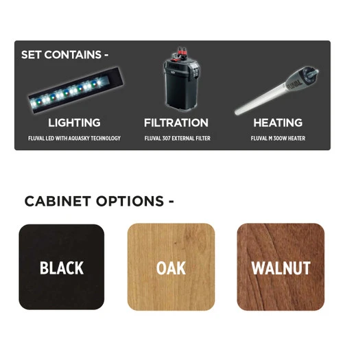 The matching oak cabinet has been thoughtfully designed with features such as an internal storage shelf and soft close hinges, fitted as standard to avoid unnecessary stress to your fish from vibrations.